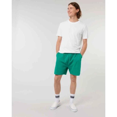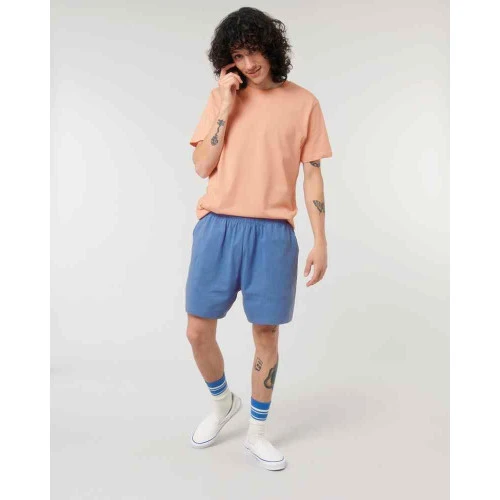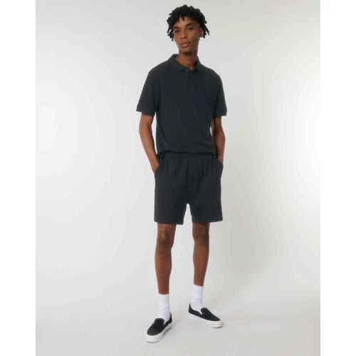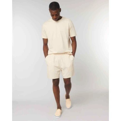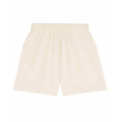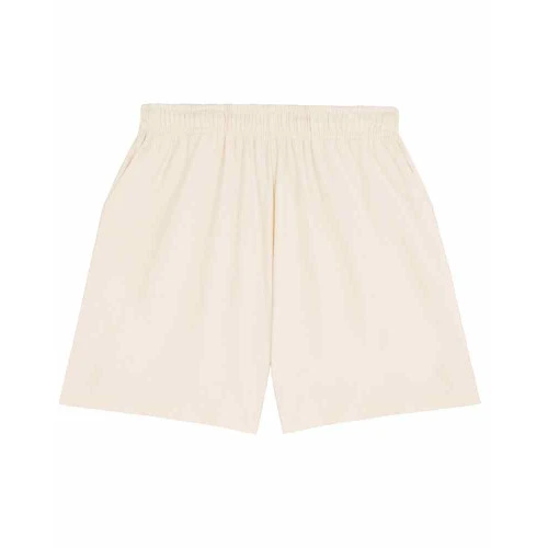 Unisex lightweight shorts. Self-fabric elastic waistband. Hidden flat drawcords on inside waistband. Pockets at front. Patch pocket at back. Bottom hem with narrow double-needle topstitch. Certified GOTS, Vegan, Fairwear, OEKO-TEX® Organic.